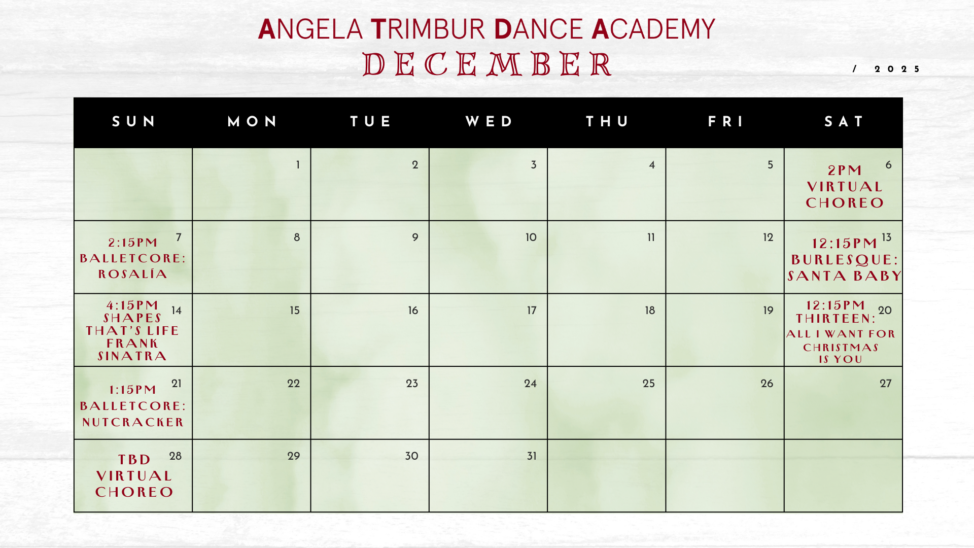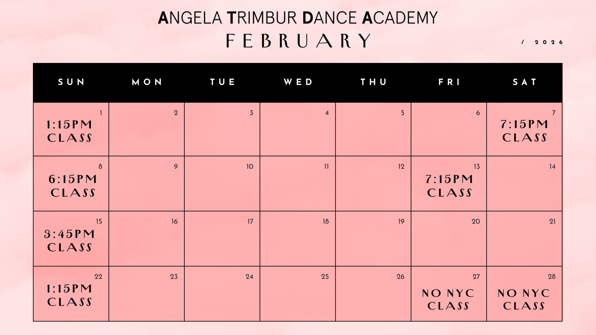 Classes are in NYC unless otherwise stated (Angela does pop-ups in other cities!)*save the dates class ticket links go live EVERY TUES at NOON for classes that week*(calendar subject to change)