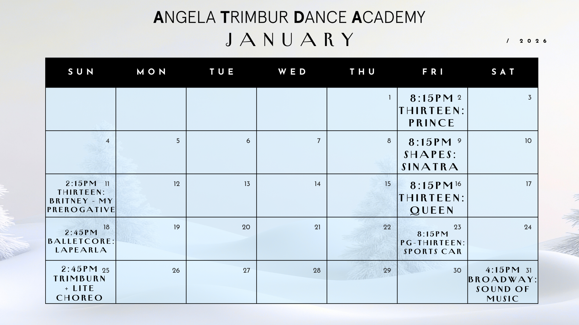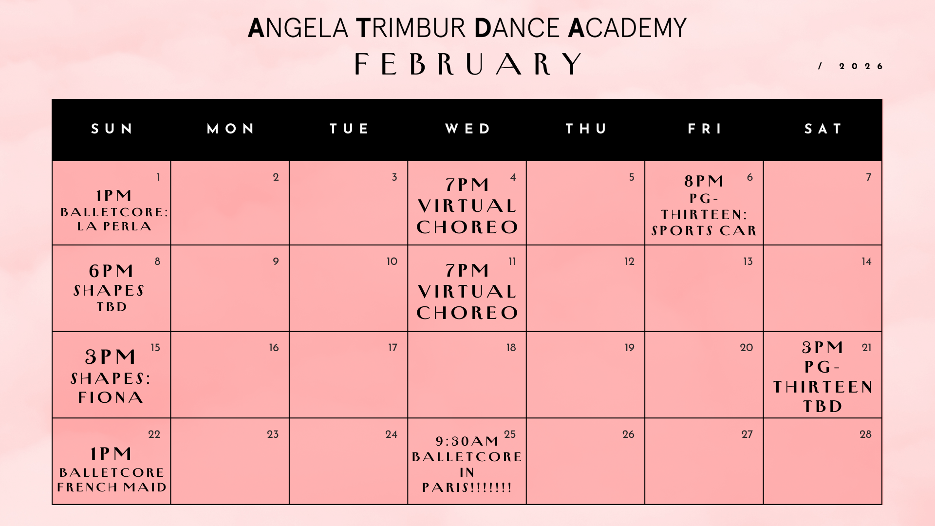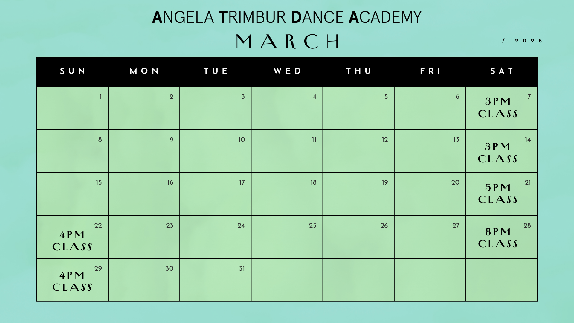 Classes are in NYC unless otherwise stated (Angela does pop-ups in other cities!)*save the dates class ticket links go live EVERY TUES at NOON for classes that week*(calendar + routines subject to change)